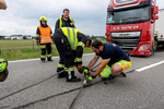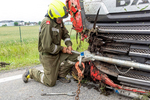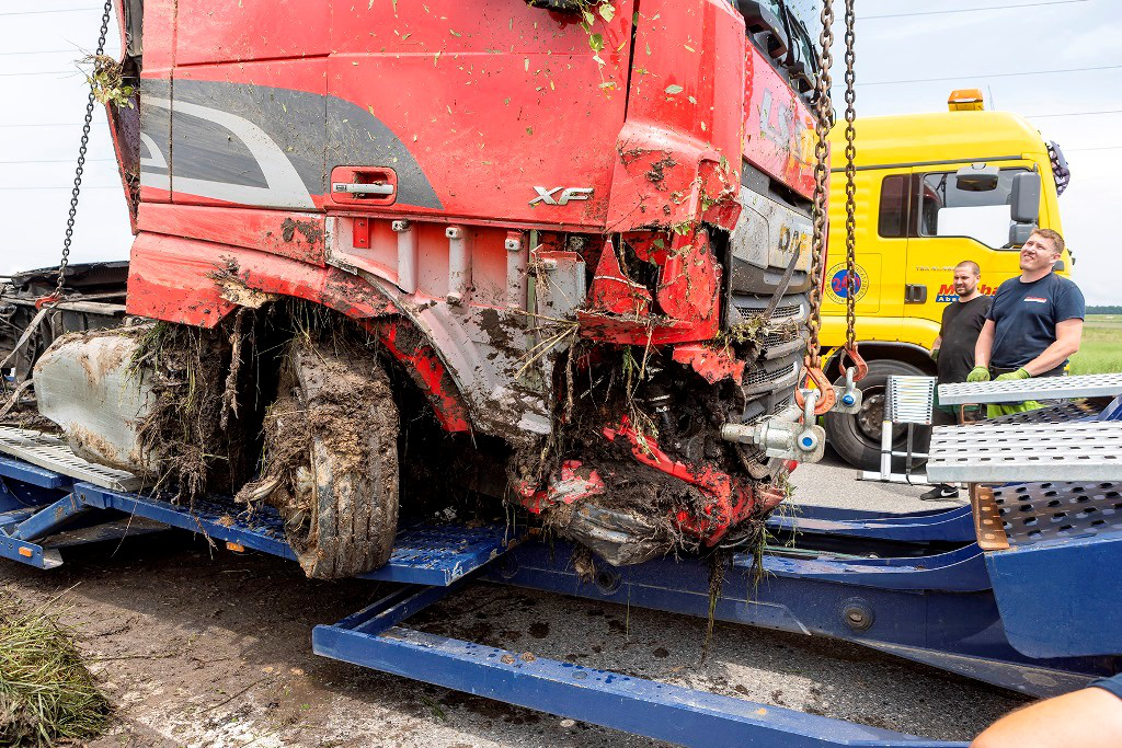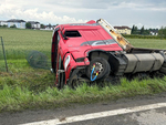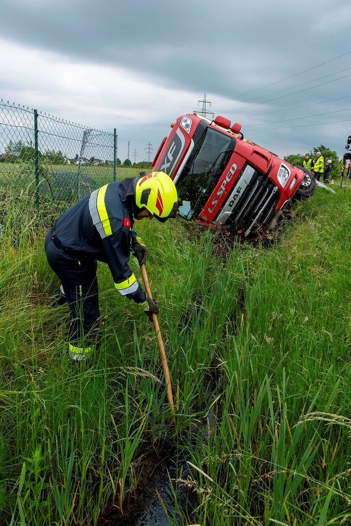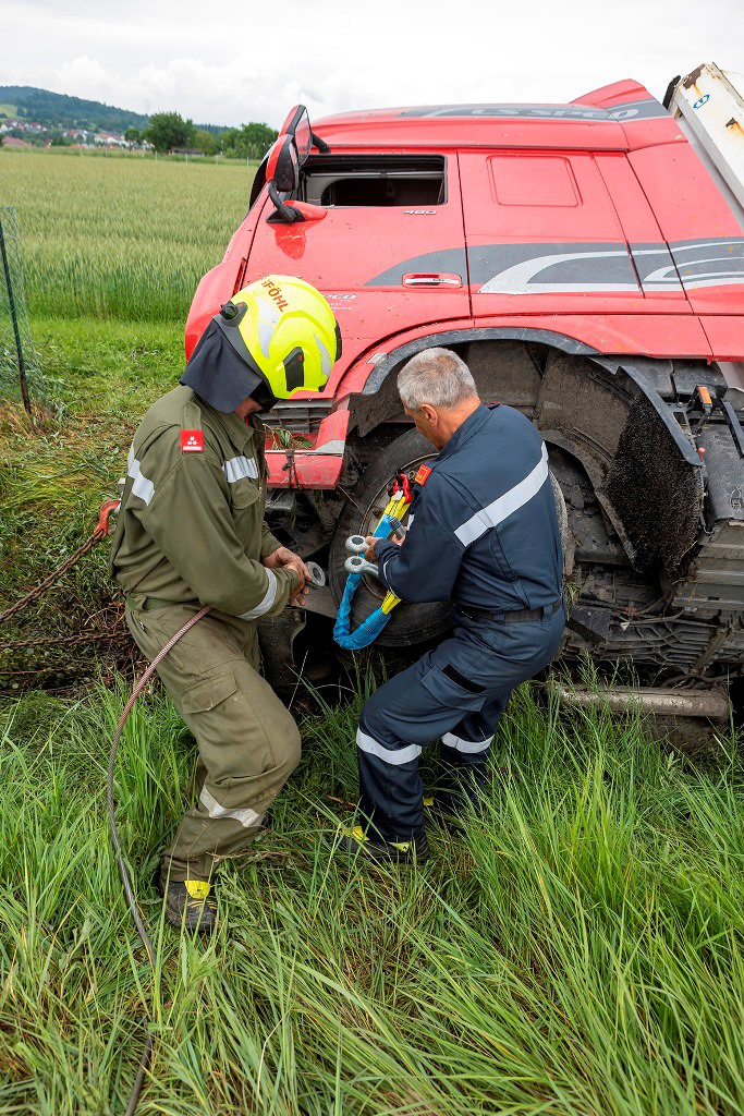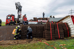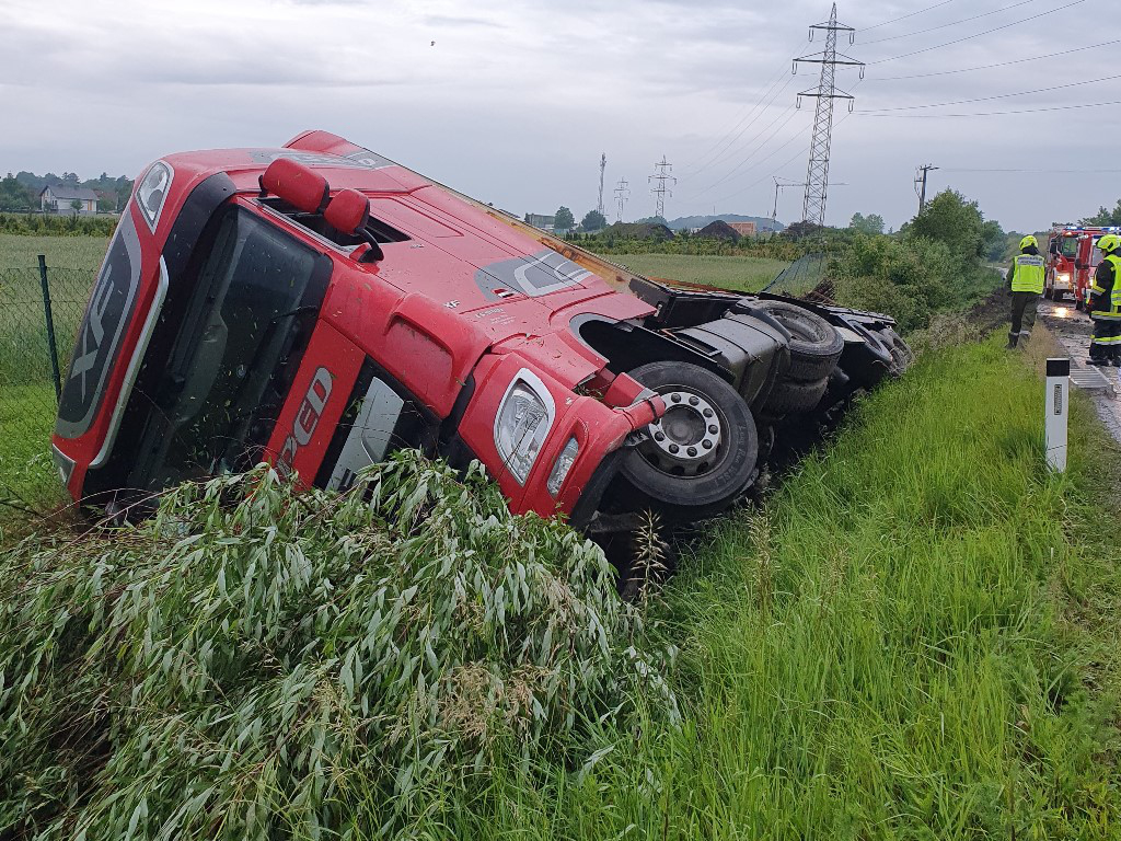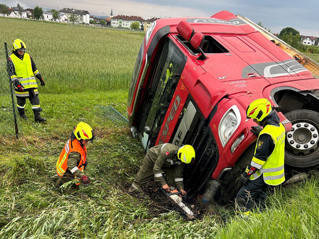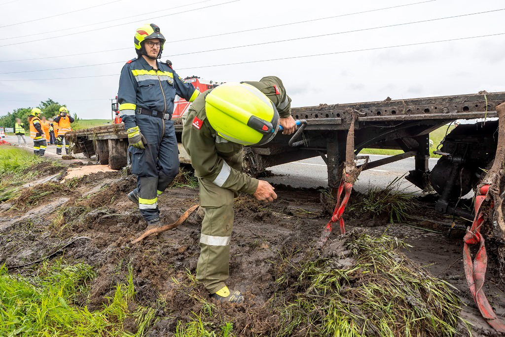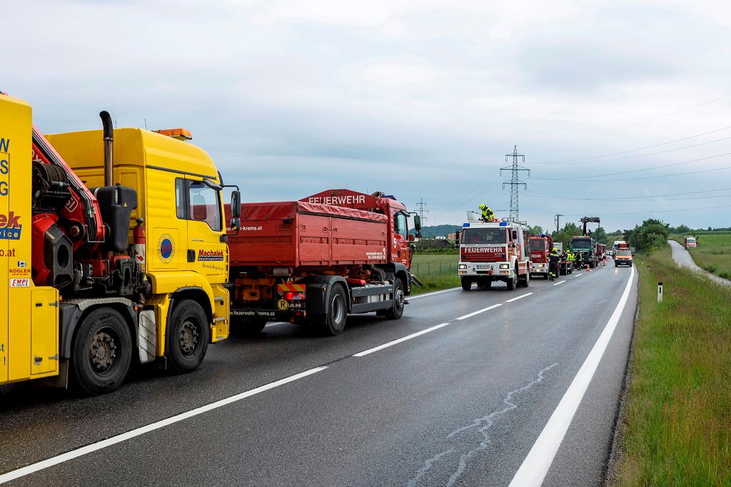 Einen fast zehnstündigen Einsatz leisteten die Feuerwehren Gföhl, Jaidhof, Lengenfeld und Krems am 9. Juni 2023. Ein mit 10 Tonnen Eisenmatten für eine Baustelle beladener Sattelzug geriet auf der Fahrt in Richtung Krems im Bereich der Umfahrung Gföhl der B37 bei Kilometer 18,600 zunächst auf das durch den Regen aufgeweichte Bankett und stürzte anschließend nach rechts in ein angrenzendes Feld. Die Lenkerin wurde verletzt und vom Roten Kreuz ins Krankenhaus gebracht. (Titel-Foto: FF Gföhl/Walpurga Spreitzer)