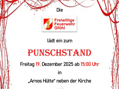 Die FF Gföhl lädt am Freitag, 19. Dezember 2025, ab 15.00 Uhr, zum Punschstand in "Arnos Hütte" neben der Kirche. Wir bieten Glühwein, Punsch, Getränke und Brote an. Der Erlös fließt in Neuanschaffungen der FF Gföhl.