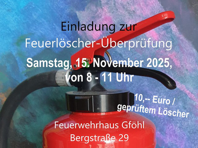 Am Samstag, 15. November 2025, besteht in der Zeit von 8 - 11 Uhr im Feuerwehrhaus Gföhl, Bergstraße 29, die Möglichkeit zur Feuerlöscherüberprüfung.