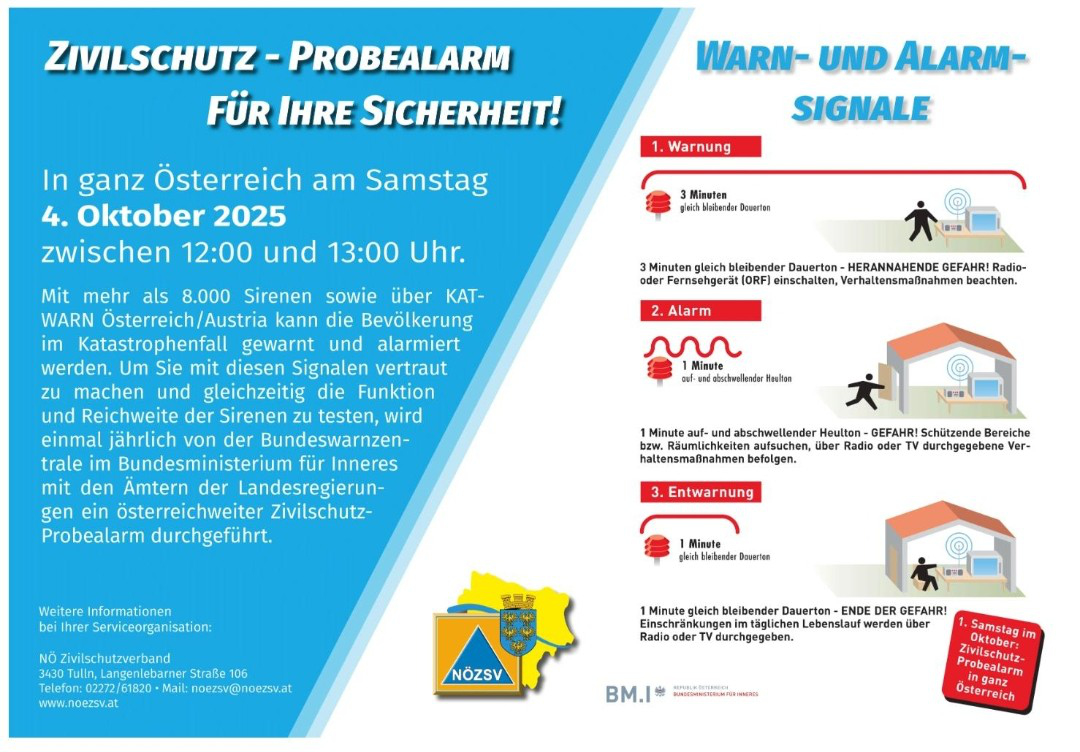 Am Samstag, 4. Oktober 2025, wird wieder ein bundesweiter Zivilschutz-Probealarm durchgeführt. Zwischen 12.00 und 12.45 Uhr werden nach dem Signal „Sirenenprobe“ die drei Zivilschutzsignale „Warnung“, „Alarm“ und „Entwarnung“ in ganz Österreich ausgestrahlt. Der Probealarm dient einerseits zur Überprüfung der technischen Einrichtungen des Warn- und Alarmsystems, andererseits soll die Bevölkerung mit diesen Signalen und ihrer Bedeutung vertraut gemacht werden.