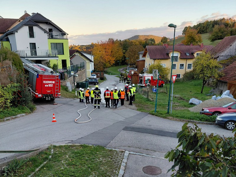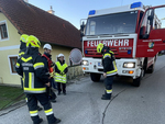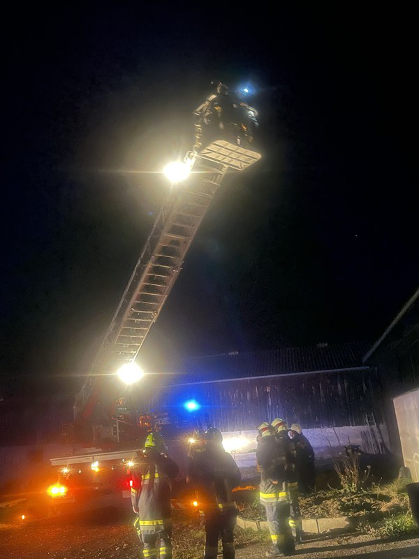 • Nach kurzem Eintreffen im FF-Haus Eisengraben um ca. 23.00 Uhr schon der nächste Alarm: Brandverdacht in Jaidhof, Drescherhütten (mittels Drehleiter von oben und Innenerkundung).