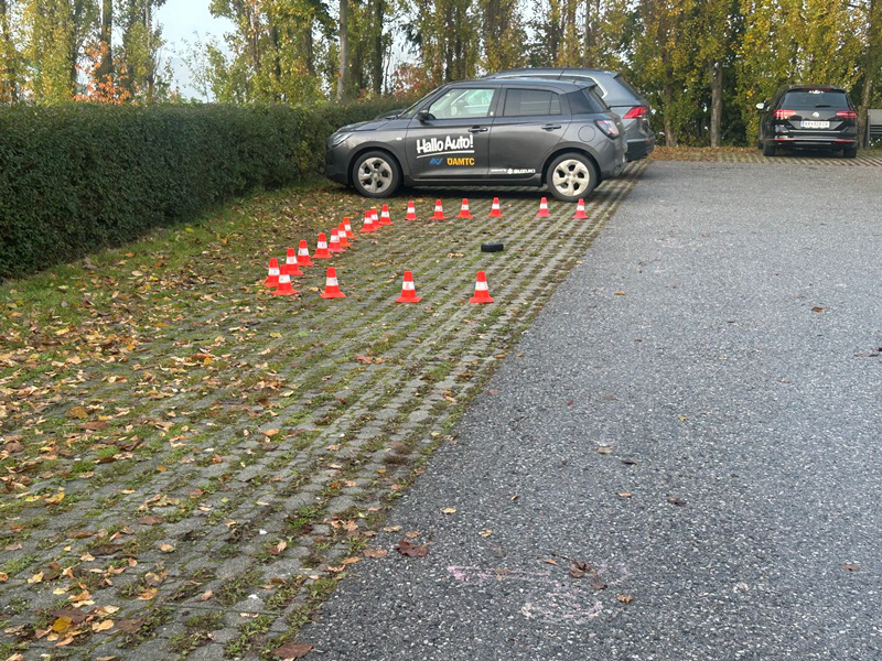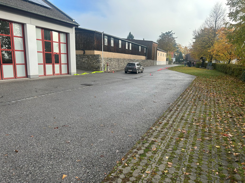 Auf dem Gelände der FF Gföhl werden für die Durchführung der Aktion perfekte Voraussetzungen gefunden. Mitglieder der FF Gföhl sind dabei auch unterstützend tätig (Sichern der Zufahrt, Herstellen einer regennassen Fahrbahn für die Bremsübung).