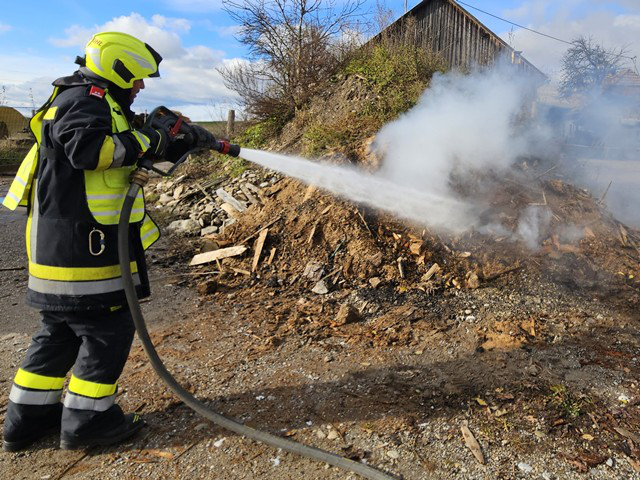 Per Sirene und stillem Alarm wurde die FF Gföhl am Dienstag, 18. November 2025, gegen 12.29 Uhr, zu einer glosenden Feuerstelle ins Gföhleramt (B1 - Rauchentwicklung) gerufen. Beim Eintreffen von Tank Gföhl (HLFA3/4000) wurde festgestellt, dass ein im Freien befindlicher Haufen mit Sägespänen bzw. Holzresten stark rauchte. Die glosenden Teile wurden unter Einsatz eines Hochdruckrohres gelöscht. Mit einem Frontlader wurde der Haufen in Folge auseinandergeschoben.