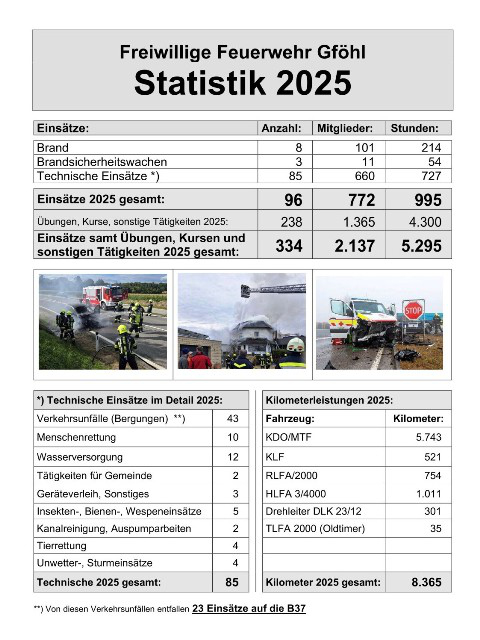 Im Jahr 2025 rückte die FF Gföhl zu insgesamt 96 Einsätzen aus (davon zu 8 Bränden, 3 Brandsicherheitswachen und 85 technischen Einsätzen). 43 Einsätze entfallen auf Bergungen nach Verkehrsunfällen (+13 zum Vorjahr), davon führten 23 Ausrückungen allein auf die B37 (+4 zum Vorjahr).